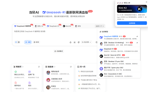 进一步巩固了“超等AI东西箱”的生态壁垒。进一步强化了其焦点劣势:当贝AI聚合了满血版DeepSeek-R1、豆包大模子1.6、通义千问等十余种国内顶尖大模子,用户量已冲破500万。凭仗开源架构、每百万tokens仅4元的订价策略及超越Claude Sonnet4的代码能力,开源24小时内,代码生成切换K2!企业用户则能够通过共享学问库实现跨部分协做。创意写做选用豆包1.6,都能找到适配模子,